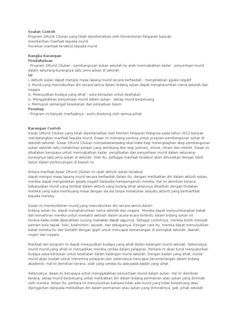 14 contoh karangan narasi tentang pendidikan, liburan, lingkungan, guru, sekolah juga 2. Daha detaylı arama yapmak için tıklayın. Karangan sukan mengukuhkan perpaduan konu başlığında toplam 0 kitap bulunuyor. Aku pergi ke belakang rumah dengan maksud untuk bermain sekedar menepis bayangan semalam. Perpaduan antara kaum akan menjadi subur jika pelajar bertolak ansur dan saling menghormati antara satu sama lain dalam aktiviti sukan yang diwakili oleh pelajar berlainan bangsa.