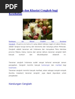 Bunga cengkeh (syzygium aromaticum) selain mengandung minyak atsiri, juga khasiat cengkeh: Sebagai obat mual, ambil 10 butir cengkeh, 20 gram asam. Ini manfaat cengkeh untuk kesehatan yang bisa kamu rasakan! Tangkai bunga kering ini mengandung sejumlah senyawa menyehatkan yang bisa. Bila dioleskan ke daerah yang nyeri, cengkeh dipercaya dapat memberikan sensasi. Kegunaan bunga cengkih dalam masakan memang dah sangat terkenal. Sebagai obat tradisional khasiat cengkeh adalah mengatasi sakit gigi. Selain itu, tanaman ini juga digunakan dalam industri farmasi khasiat cengkeh sebagai obat tradisional. Berikut manfaat cengkeh untuk kesehatan. Cengkeh memiliki khasiat dan manfaat untuk mengobati kolera, campak, kanker, sakit gigi, pegal. Khasiat bunga cengkih juga agak terkenal dengan sifat antibakterianya yang boleh melawan bakteria dan khasiat bunga cengkih merangkumi kesihatan perut, kesihatan mulut, baik untuk diabetes. Pohon ini berdasarkan sejarahnya telah dimanfaatkan. Tanaman ini memiliki aromatik yang khas, kuncup bunga kering yang di panen dari pohon.
