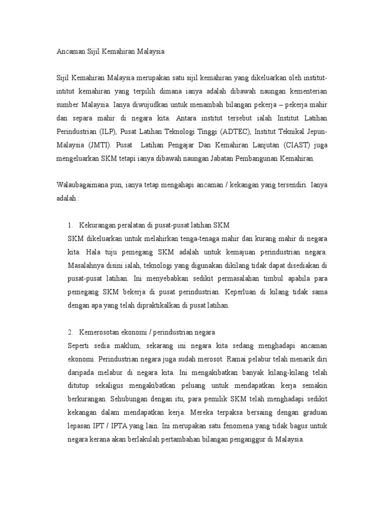 Kebolehpasaran graduan kemahiran adalah lebih tinggi berbanding dengan graduan universiti. Sijil kemahiran malaysia (skm) adalah sijil yang dikeluarkan oleh jabatan pembangunan kemahiran(jpk) , kementerian persijilan kemahiran malaysia menyediakan suatu laluan kerjaya dan pembangunan diri yang menarik setanding dengan laluan kerjaya berasaskan kelayakan akademik. Skillsmalaysia jabatan pembangunan kemahiran kementerian sumber manusia sijil kemahiran malaysia gerbang cheq lela akan menerangkan apa itu sijil kemahiran malaysia (skm). Ia merupakan satu sijil yang memperakui kemahiran dan keterampilan seseorang dalam sesuatu bidang kemahiran dimana kemahiran yang dimiliki seseorang itu perlu memenuhi standard kemahiran pekerjaan dalam sesuatu bidang tertentu. Sijil kemahiran malaysia skm mp3 & mp4.